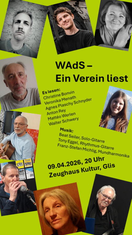 Wir holen den aufgrund des ausserordentlichen Schneefalls verschobenen Abusitz vom April 2025 nach. Agnes Plaschy, Veronika Menath, Christine Bonvin, Toni Rey, Walter Schwery und Matteo Werlen geben einen bunt gemischten Überblick über das literarische Schaffen innerhalb der WAdS. Der Abend wird musikalisch umrahmt von Franz-Stefan Michlig (Mundharmonika), Tony Eggel (Rhythmus-Gitarre) und Beat Seiler (Solo-Gitarre).